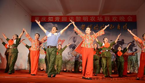 晚上,知青回访团在农场文化宫和农场职工群众一起,进行联欢,勐海县委副书记付开云、勐海县副县长钢图等领导也出席了晚会。在晚会开始之前,回访团的老团长和知青们为在场的观众吹奏了萨克斯和歌曲合唱,在晚会上,农场文艺队、老年大学、和知青回访团的演员们精彩的表演赢得了在场观众的阵阵掌声。晚会在农场党委书记王子能上台朗诵他为知青回访即兴创作的诗时达到了高潮,在农场机关特意为农场困难职工捐赠的仪式上,虽然主持人一再强调捐款不针对在场观众和知青。可是知青们纷纷慷慨解囊。还带着知青第三代上台捐款。他们深情地说:黎明农场也是自己的家,现在家里有了困难,自己一定也要尽微薄之力,晚会在王子能书记作词,刀洪勇作曲的一曲优美动听的《黎明妈妈》歌声中结束了,可是知青们和农场职工的心与心的交流在刚刚开始。