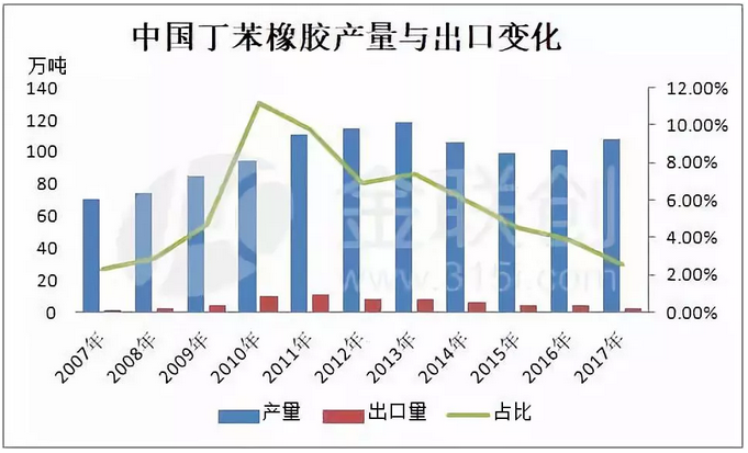 丁苯橡胶作为重要的合成橡胶产品,经过长期发展,尤其是2007年以后的集中建设,中国乳聚和溶聚丁苯橡胶的设计产能已经达到192万吨(含未投产装置),同期丁苯橡胶的产量也由2007年的70万吨增加至2017年的108万吨。但是,出口却为却未见有效增长。