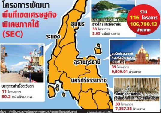 泰南4府经济走廊(SEC)整体发展规划方案正式获得内阁批示,按照规划未来4年将投入2000亿铢,从4个方面发掘泰南未来经济潜力。